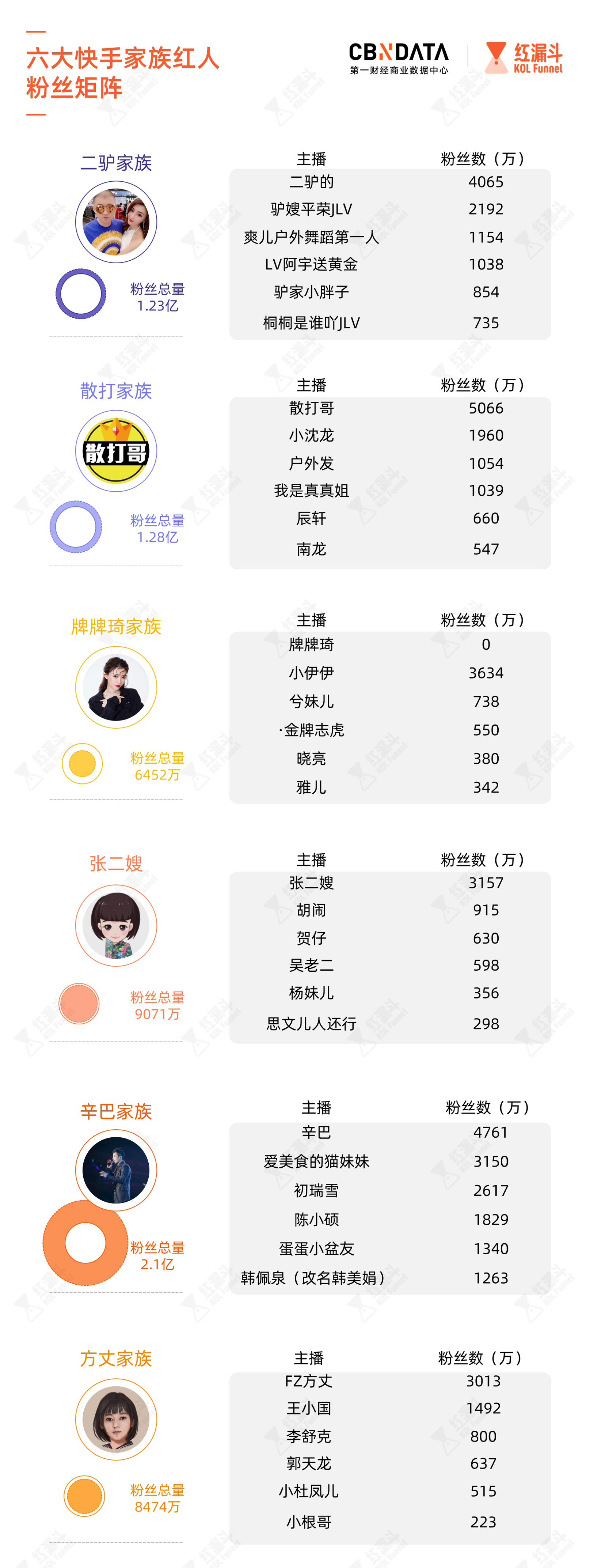 以核心主播的粉丝排名,散打哥以超过5000万粉丝名列第一,辛巴以4965万粉丝屈居第二;以家族粉丝数排名,辛巴家族以2亿粉丝数量傲视其他5大家族;如果要以徒弟、签约主播的数量排名,张二嫂最新公布的徒弟、徒孙数量多达41名,位于6大家族之首;根据总体带货数据排名,辛巴旗下拥有最多的破亿主播,紧接其后的是二驴家族。