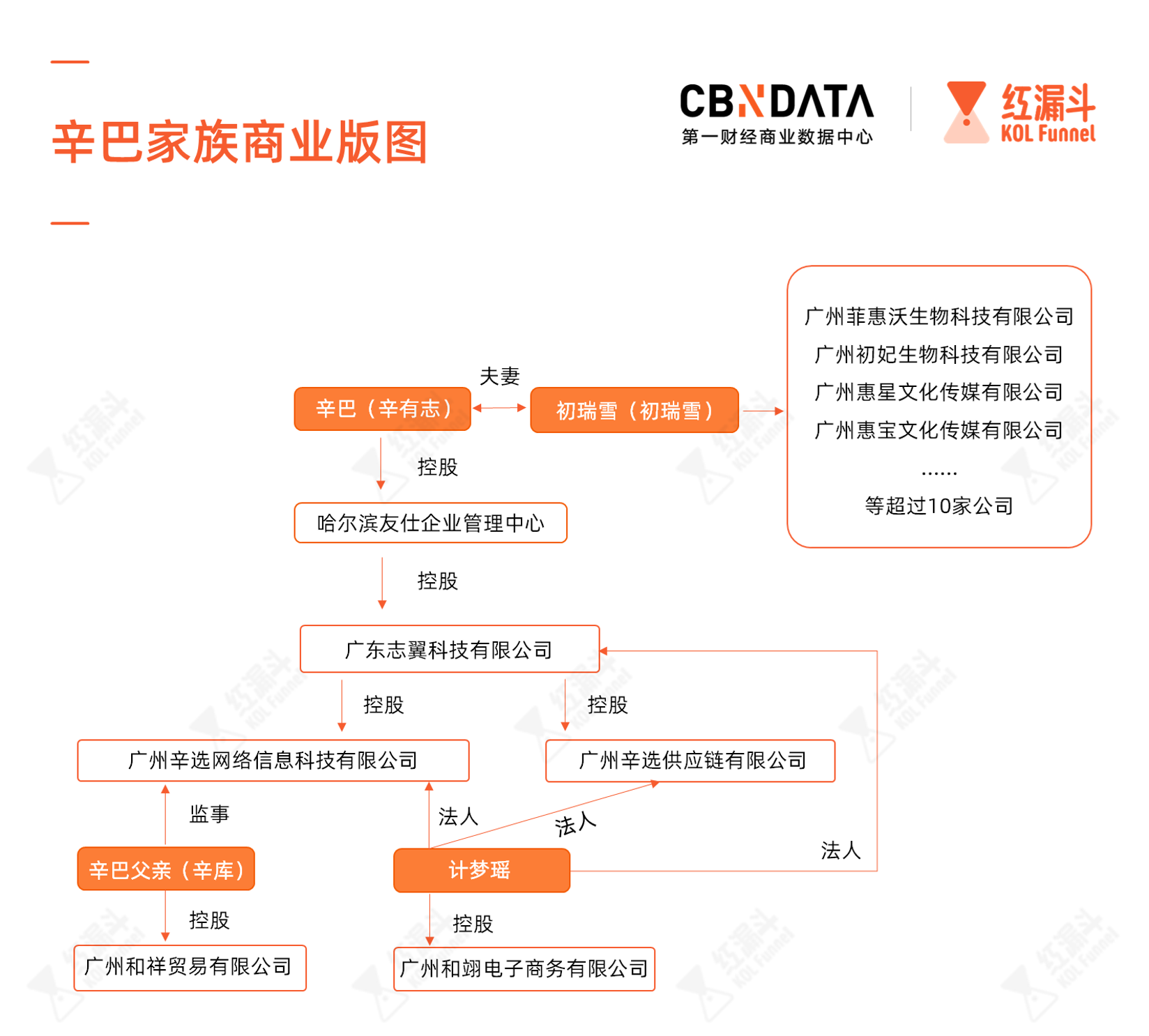 以辛巴(真名:辛有志)为例,通过其父辛库、其妹计梦瑶的控股,家庭成员至少拥有广州辛选供应链有限公司、广州辛选网络信息科技有限公司、广东志翼科技有限公司、杭州辛橙信息科技有限公司等7家公司。