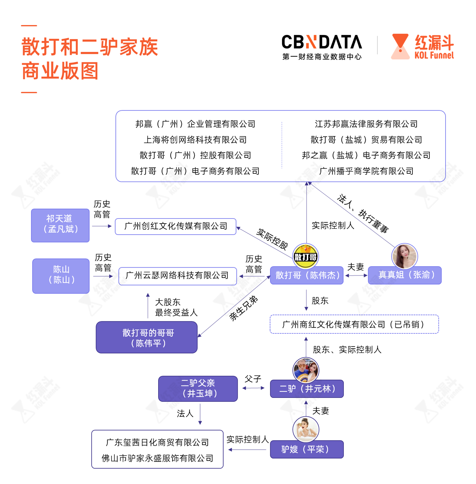 散打哥(真名:陈伟杰)与妻子张渝一起,旗下共有散打哥(广州)控股有限公司、广东创红文化传媒有限公司、上海将创网络科技有限公司、广州播乎商学院有限公司、散打哥(广州)电子商务有限公司、正娱传媒(广州)有限公司等超过10家公司。