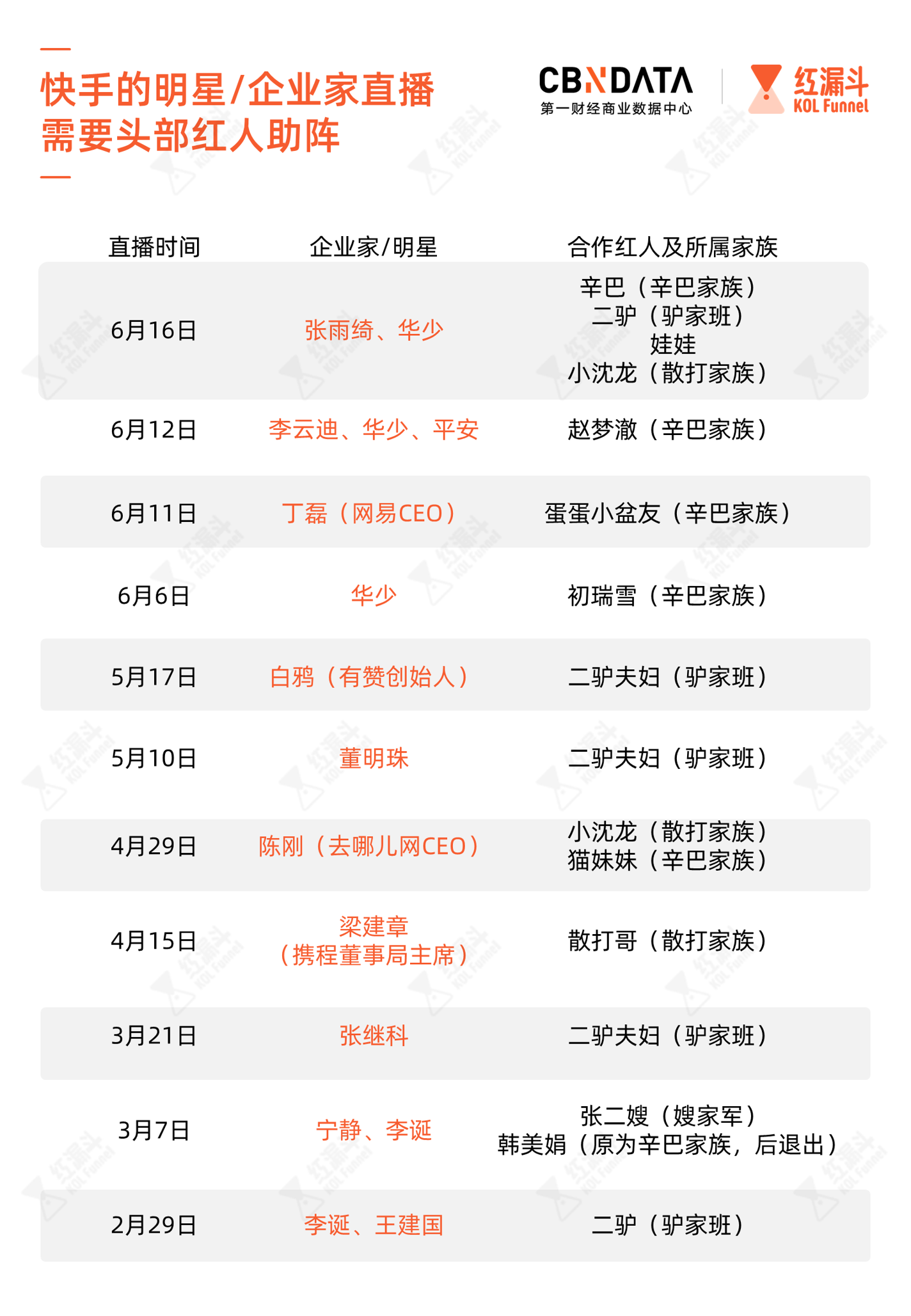今年4月起,来到快手直播带货的企业家包括格力董明珠、携程梁建章、网易丁磊等总裁级别的人物。他们创造惊人战绩的背后,往往离不开头部家族的红人。我们曾经对董明珠快手二播、丁磊快手首播有过详细的分析。