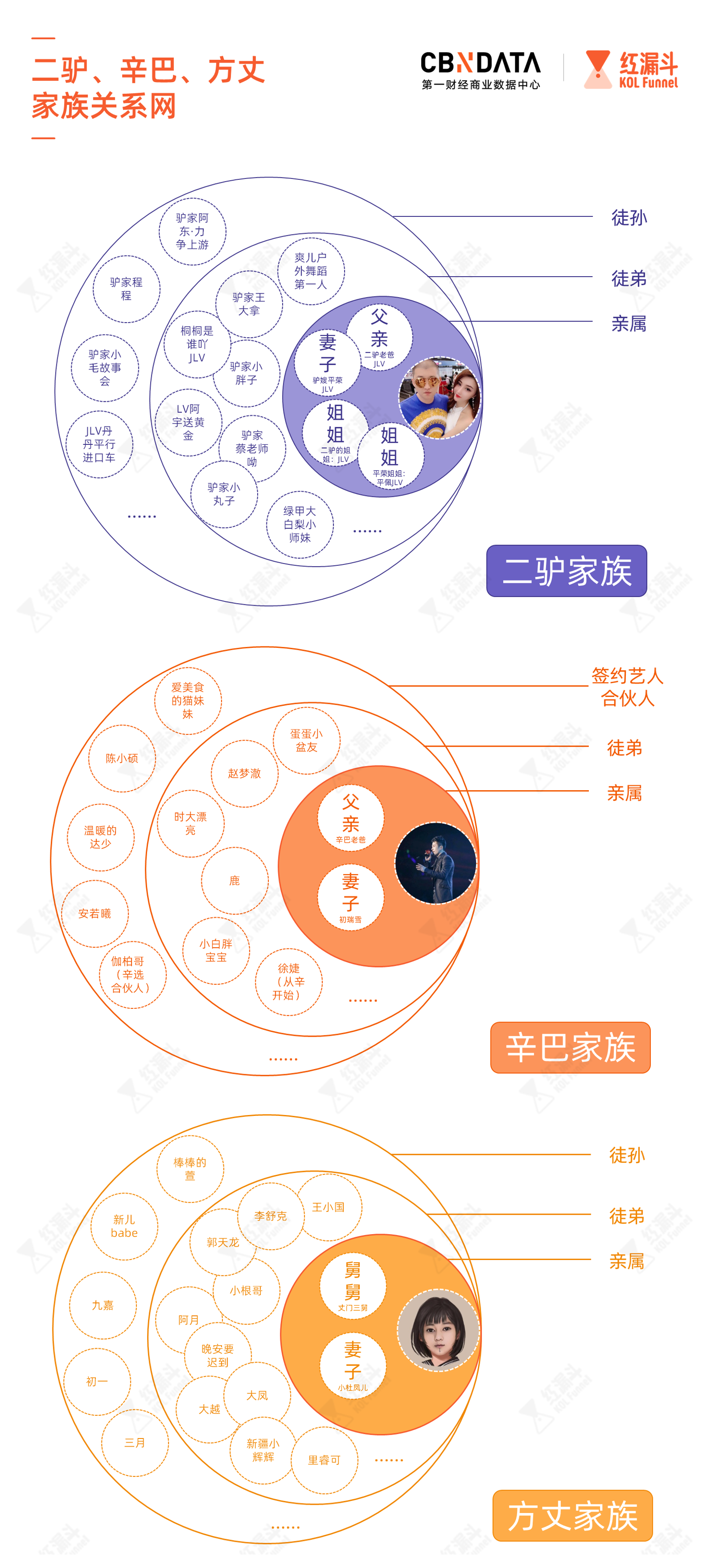 圆心通常是这个家族的核心主播,往往以夫妻档/情侣档共同经营事业,比如辛巴与初瑞雪夫妻,二驴与平荣夫妻。他们有血缘关系的家人也会开通账号,加入快手主播大军。再往外一圈,就是头部主播收的徒弟、签约艺人主播,最外围则是徒弟们再收的徒弟,也就是徒孙。