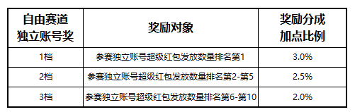 自由赛道独立账号奖励分三档,赛马阶段超级红包发放数量排名第1的独立账号,奖励分成比例加点3%;赛马阶段超级红包发放数量排名第2-第5的独立账号,奖励分成比例加点2.5%;赛马阶段超级红包发放数量排名第6-第10的独立账号,奖励分成比例加点2%。最终奖励名额按照团队数量确定,如自由赛道参赛团队总数35个,则总奖励账号数为5个,最终奖励对象为排名第1、排名第2-第5两档。