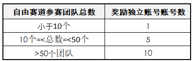1、自由赛道独立账号奖励个数依据该赛道参赛团队数确定,奖励独立账号数将在报名完成后公布。